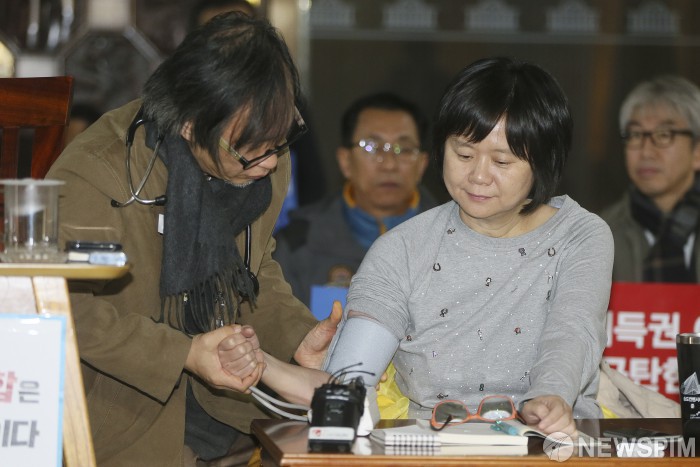 [서울=뉴스핌] 이형석 기자 = 이정미 정의당 대표가 9일 오후 서울 여의도 국회 로텐더홀에서 더불어민주당-자유한국당의 2019년 예산안 합의에 반발하며 나흘째 단식 농성을 이어가고 있다. 이날 의료진이 이 대표의 건강상태를 점검하고 있다. 2018.12.09 leehs@newspim.com