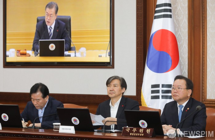 [서울=뉴스핌] 최상수 기자 = 11일 오전 서울 종로구 정부서울청사에서 열린 서울-세종 화상 국무회의가 열리고 있다. 왼쪽부터 정태호 청와대 일자리수석, 조국 민정수석, 김부겸 행정안전부 장관. 2018.12.11 kilroy023@newspim.com