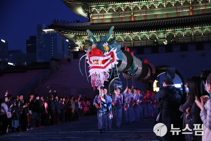 | [서울=뉴스핌] 이윤청 기자 = 제4회 궁중문화축전의 개막제 '세종 600년, 미래를 보다'가 28일 저녁 서울 종로구 경복궁 흥례문 광장에서 열리고 있다. 이날 개막제는 조선시대 최고의 국가축제인 '산대희' 형식을 빌려 시대를 앞선 세종의 철학과 업적을 선보였다. 2018.4.28 deepblue@newspim.com |