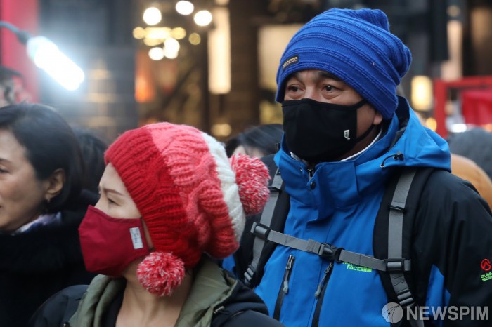 [서울=뉴스핌] 정일구 기자 = 중국발 스모그가 유입되면서 전국 초미세먼지 농도가 '나쁨' 수준을 보이는 17일 오후 서울 중구 명동 인근에서 관광객들이 마스크를 쓴 채 거리를 걷고 있다. 2018.12.17 mironj19@newspim.com