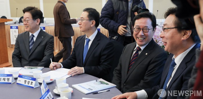[서울=뉴스핌] 최상수 기자 = 이재명 경기도지사, 정성호 국회 기획재정위원회 위원장, 김한정 더불어민주당 의원, 이화영 경기도 평화부지사가 19일 오전 서울 여의도 국회에서 열린 '아파트 분양원가 공개' 토론회에 참석하고 있다. 2018.12.19 kilroy023@newspim.com