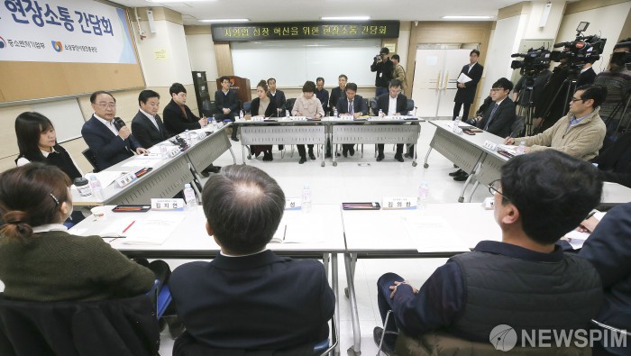[서울=뉴스핌] 이형석 기자 = 홍남기 부총리 겸 기획재정부 장관(왼쪽 두번째)이 20일 오전 서울 종로구 소상공인진흥재단 서울전용교육장에서 열린 자영업 성장‧혁신을 위한 현장소통 간담회에서 모두발언을 하고 있다. 2018.12.20 leehs@newspim.com