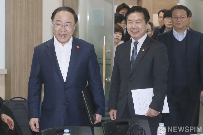 [서울=뉴스핌] 이형석 기자 = 홍남기 부총리 겸 기획재정부 장관(왼쪽)과 홍종학 중소벤처기업부 장관이 20일 오전 서울 종로구 소상공인진흥재단 서울전용교육장에서 열린 자영업 성장‧혁신을 위한 현장소통 간담회에 참석하고 있다. 2018.12.20 leehs@newspim.com