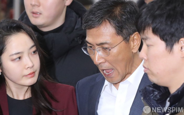 [서울=뉴스핌] 최상수 기자 = '비서 성폭행' 관련 강제추행 등 혐의에 대해 1심에서 무죄를 선고받은 안희정 전 충남도지사가 21일 오전 서초구 서울고등법원에서 열린 항소심 1회 공판에 출석 도중 취재진의 질문에 답변하고 있다. 2018.12.21 kilroy023@newspim.com