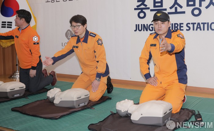 [서울=뉴스핌] 윤창빈 수습기자 = 텍사스 레인저스 추신수 선수(오른쪽)가 26일 오전 서울 중구 중부소방에서 열린 ‘소방관 응원 캠페인’에서 CPR(심폐소생술)실습을 하고 있다. 2018.12.26 pangbin@newspim.com