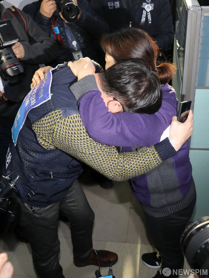 [서울=뉴스핌] 최상수 기자 = 27일 오후 서울 여의도 국회 환경노동위원회 고용노동소위원회에서 여야3당 합의 결과가 발표된 후 고(故) 김용균씨 유족 및 동료들이 눈물을 흘리고 있다. 2018.12.27 kilroy023@newspim.com