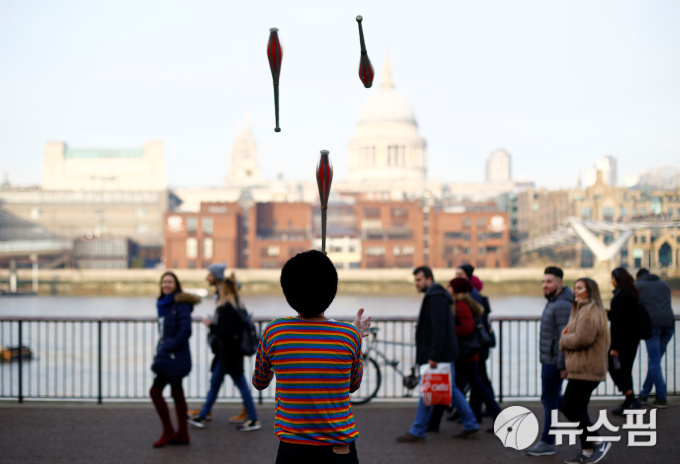 | [런던 로이터=뉴스핌] 정윤영 인턴기자 = 27일(현지시각) 영국 런던 사우스 뱅크 거리에서 한 남성이 저글링 공연을 펼치고 있다. 2018.12.27. |