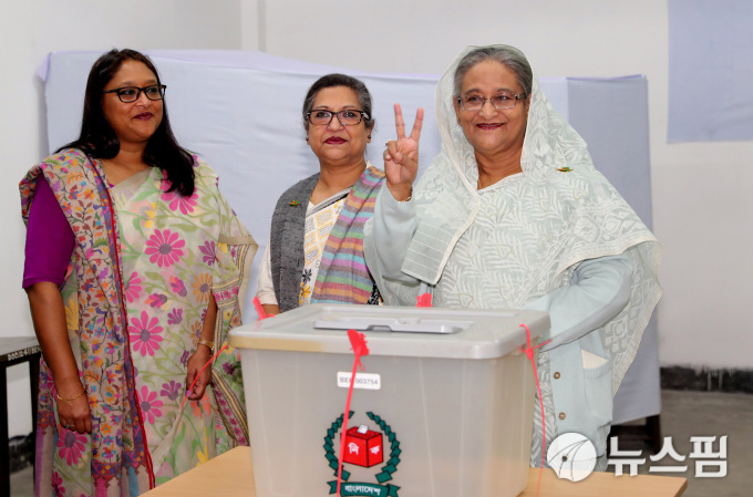 | [다카 로이터=뉴스핌] 이홍규 기자 =30일(현지시간) 방글라데시에서 총선이 실시된 가운데 셰이크 하시나 총리가 이날 아침 수도 다카에서 투표를 한 뒤 제스처를 취하고 있다. 2018.12.30. |