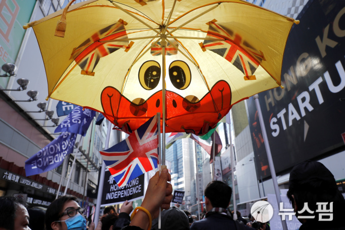 | [홍콩 로이터=뉴스핌] 이홍규 기자 = 한 홍콩 독립운동 지지자가 홍콩에서 열린 연례 신년행사에서 영국 국기와 함께 우산을 들고 있다. 2018.01.01. |