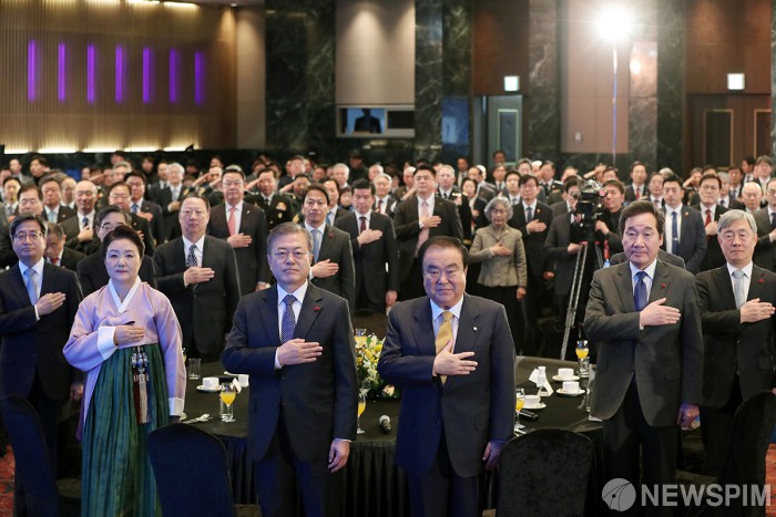 [서울=뉴스핌] 문재인 대통령과 김정숙여사가 2일 오전 서울 여의도 중소기업중앙회에서 '더! 잘사는, 안전한, 평화로운 대한민국'을 주제로 열린 2019년 신년회에 참석해 국민의례를 하고 있다.[사진=청와대] 2019.1.2