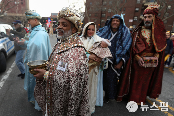 | [뉴욕 로이터=뉴스핌] 황숙혜 기자 = 아기 예수를 안은 마리아와 조셉, 그리고 동방박사로 분장한 이들이 뉴욕 맨해튼에서 ‘쓰리 킹스 데이’ 퍼레이드를 가졌다. 2019. 01. 04. |