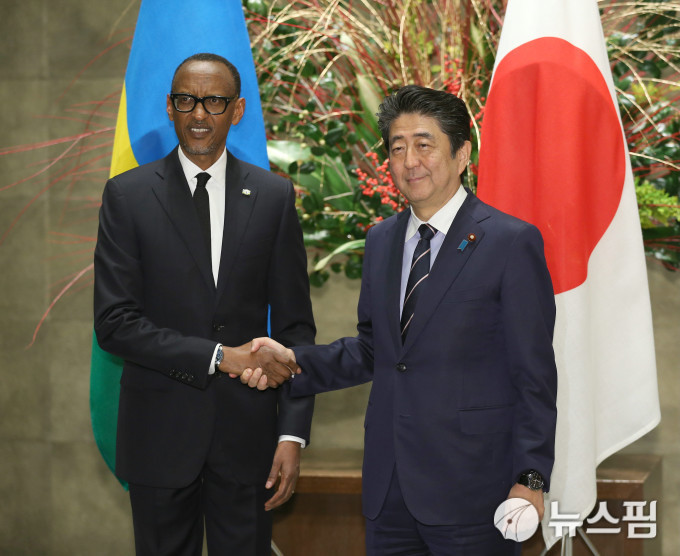 | [도쿄 지지통신=뉴스핌] 오영상 전문기자 = 8일 일본을 방문한 폴 카가메 르완다 대통령과 악수하는 아베 신조(安倍晋三) 일본 총리. 2019.01.08 |