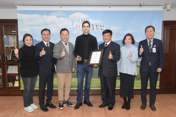 | 동두천시는 9일 프랑스인 '바질 쁘비용(Basile Peuvion)'씨를 문화발전 공로로 명예시민 증서를 수여했다.[사진=동두천시] |