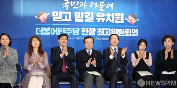 [서울=뉴스핌] 정일구 기자 = 11일 오전 서울 구로구 혜원유치원에서 열린 더불어민주당 국민과 더불어 '믿고 맡길 유치원' 현장최고위원회의에서 이해찬 대표, 홍영표 원내대표와 유치원 관계자들이 박수를 치고 있다. 2019.01.11 mironj19@newspim.com