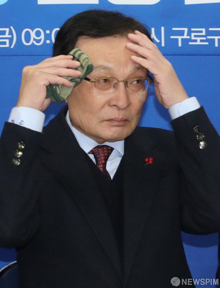 [서울=뉴스핌] 정일구 기자 = 11일 오전 서울 구로구 혜원유치원에서 열린 더불어민주당 국민과 더불어 '믿고 맡길 유치원' 현장최고위원회의에서 이해찬 대표가 땀을 닦고 있다. 2019.01.11 mironj19@newspim.com