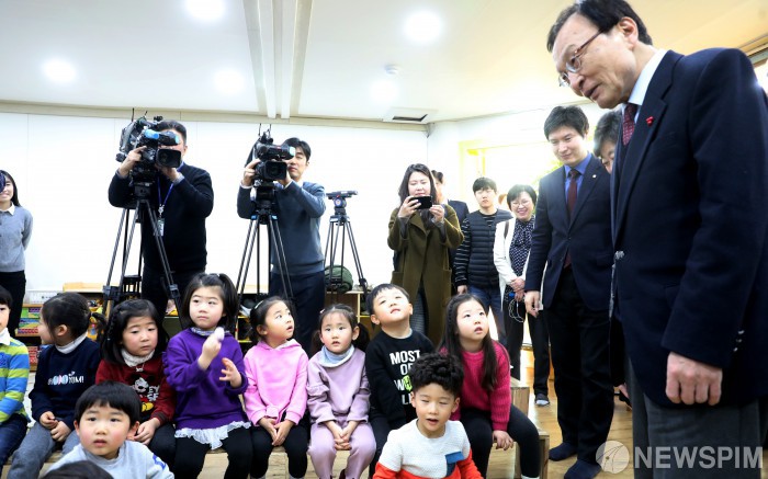 [서울=뉴스핌] 정일구 기자 = 더불어민주당 이해찬 대표가 11일 오전 서울 구로구 혜원유치원을 방문해 아이들과 대화를 하고 있다. 2019.01.11 mironj19@newspim.com