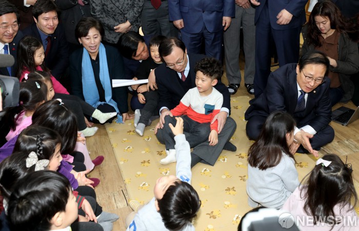 [서울=뉴스핌] 정일구 기자 = 더불어민주당 이해찬 대표, 홍영표 원내대표와 최고위원들이 11일 오전 서울 구로구 혜원유치원을 방문해 아이들과 대화를 하고 있다. 2019.01.11 mironj19@newspim.com
