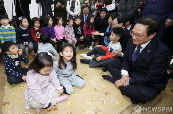 [서울=뉴스핌] 정일구 기자 = 더불어민주당 홍영표 원내대표가 11일 오전 서울 구로구 혜원유치원을 방문해 아이들과 대화를 하고 있다. 2019.01.11 mironj19@newspim.com