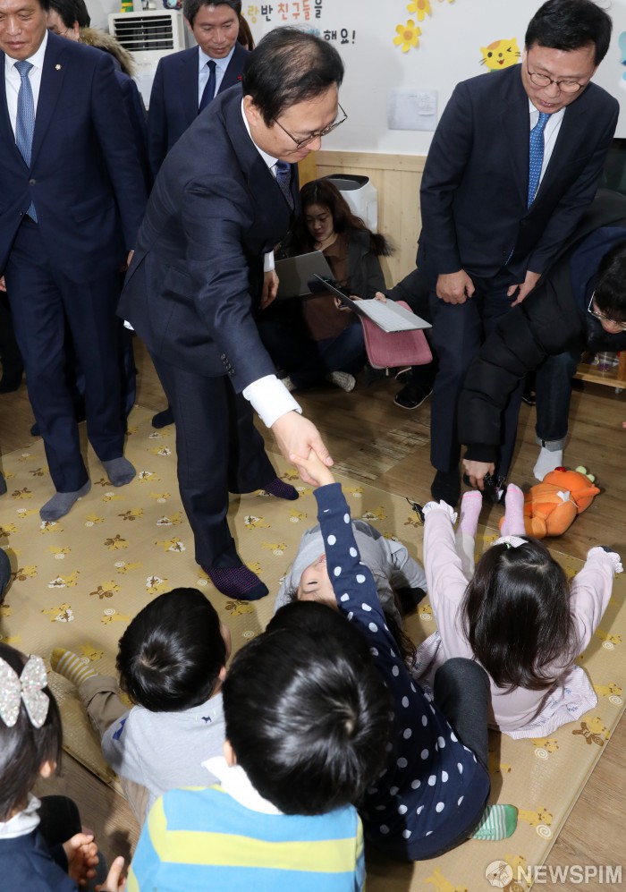 [서울=뉴스핌] 정일구 기자 = 더불어민주당 홍영표 원내대표가 11일 오전 서울 구로구 혜원유치원을 방문해 아이들과 악수를 하고 있다. 2019.01.11 mironj19@newspim.com