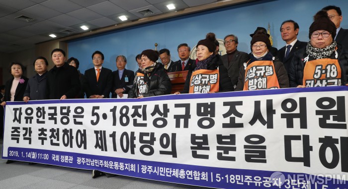 [서울=뉴스핌] 김학선 기자 = 5.18 피해자 유족들과 광주 전남 5.18 단체 관계자들이 14일 국회 정론관에서 자유한국당의 5.18 진상규명조사위원 추천과 관련한 기자회견을 하고 있다. 2019.01.14 yooksa@newspim.com