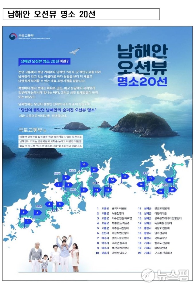 남해안 오션뷰 명소 20선은 경남 거제에서 전남 고흥까지 펼쳐진 수려한 남해안 조망지 중 특히 뛰어난 풍광을 자랑하는 조망지점 20곳이다.