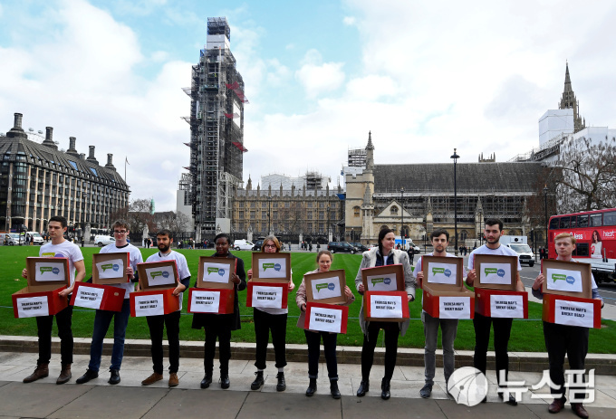 | [런던 로이터=뉴스핌] 정윤영 인턴기자 = 14일(현지시각) 영국 국회의사당 부근에서 브렉시트를 찬성하는 시민단체 '피플스 보트(People's Vote)' 회원들이 캠페인 유세를 벌이고 있다. 2019.01.14. |