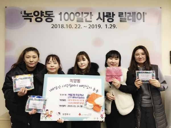 이날 기부는 손뜨개 학부모 동아리 회원 6명이 약 4개월간 직접 만든 목도리로, 녹양동에 거주하는 저소득층 아이들이 따뜻한 겨울을 날 수 있도록 전달됐다.