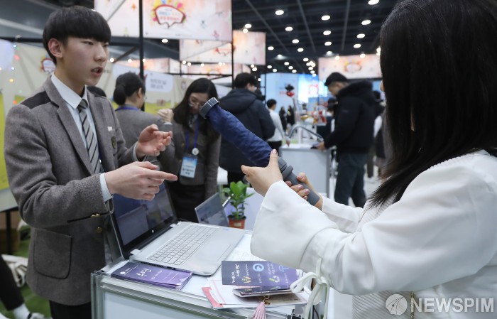 [서울=뉴스핌] 윤창빈 수습기자 = 15일 오후 서울 서초구 양재aT센터에서 열린 ‘2018 대한민국 청소년 창업경진대회’에서 본선 대회에 참가한 학생들이 자신들이 개발한 제품을 관람객들에게 소개해 주고 있다. 학생들은 동아리끼리 모바일 가상투자 방식으로 실시간 평가를 하고, 일반인 관람객도 모바일 가상투자가 가능하다. 2019.01.15 pangbin@newspim.com