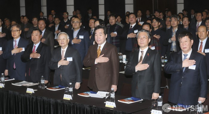 [서울=뉴스핌] 이형석 기자 = 이낙연 국무총리와 손경식 한국경영자총협회장을 비롯한 기업인들이 24일 오전 서울 중구 웨스틴조선호텔에서 열린 제42회 전국 최고경영자 연찬회에서 국민의례를 하고 있다. 왼쪽부터 윤부근 삼성전자 부회장, 이희범 LG상사 고문, 손 회장, 이 총리, 성윤모 산업통상자원부 장관, 윤여철 현대자동차 부회장. 2019.01.24 leehs@newspim.com
