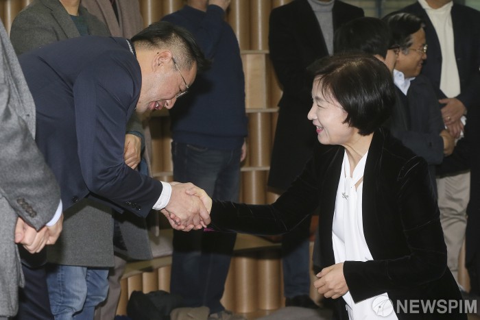 [서울=뉴스핌] 이형석 기자 = 추미애 더불어민주당 혁신성장추진위원장이 25일 오전 서울 강남구 팁스타운에서 열린 현장 최고위원회의에서 기업인들과 악수를 하고 있다. 2019.01.25 leehs@newspim.com