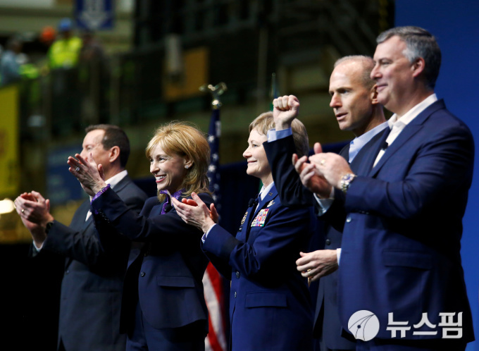 [에버렛 로이터=뉴스핌] 남혜경 인턴기자 = (왼쪽부터) 마이크 기본스 보잉 부사장 겸 보잉 급유기 '페가수스'(KC-46) 프로그램 매니저, 리앤 캐럿 총괄부사장, 메리앤 밀러 미 공군 장성, 데니스 뮬렌버그 회장, 케빈 맥알리스터 상업용 항공기 부문 최고경영자(CEO)가 워싱턴주(州) 에버렛 소재의 공군 페가수스 납품 기념행사서 박수치고 있다. 2019.01.24. |
