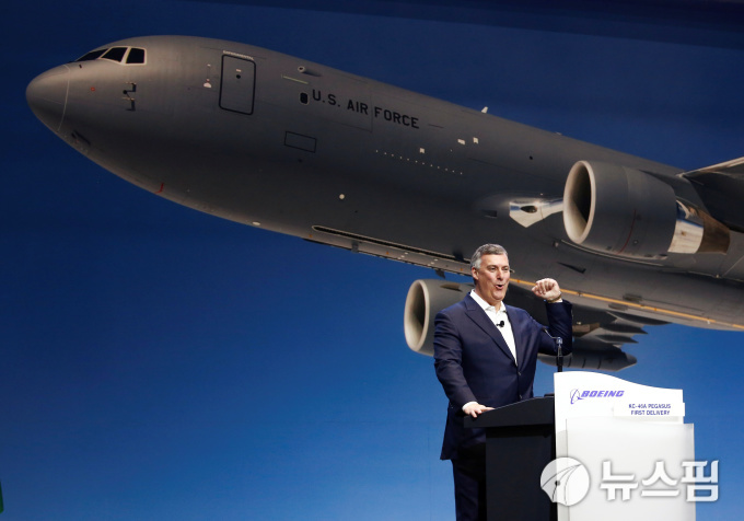 | [로이터=뉴스핌] 남혜경 인턴기자 = 케빈 맥알리스터 보잉 상업용 항공기 부문 사장 겸 최고경영자(CEO)가 워싱턴주(州) 에버렛 소재의 공중급유기 '페가수스'(KC-46) 납품 기념행사 중 포즈를 취하고 있다. 2019.01.24. |