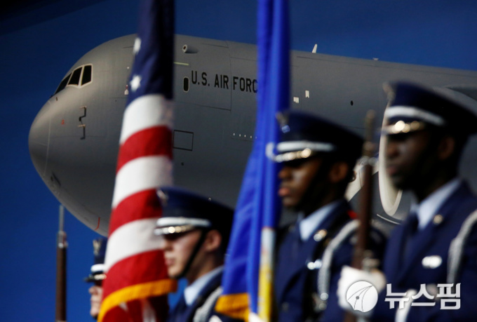 | [에버렛 로이터=뉴스핌] 남혜경 인턴기자 = 미국 공군 의장대가 워싱턴주(州) 에버렛 소재의 공군 공중급유기 '페가수스'(KC-46) 납품 기념행사 중 무대에 서 있다. 2019.01.24. |