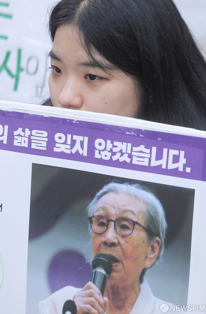 [서울=뉴스핌] 윤창빈 수습기자 = 30일 오후 서울 종로구 옛 일본대사관 앞에서 열린 제1372차 수요집회겸 김복동 할머니 추모식에서 한 참가자가 피켓을 들고 있다. 2019.01.30 pangbin@newspim.com