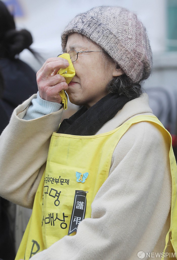 [서울=뉴스핌] 윤창빈 수습기자 = 30일 오후 서울 종로구 옛 일본대사관 앞에서 진행된 제1372차 수요집회에서 돌아가신 위안부 피해자 김복동 할머니를 추모하며 한 참가자가 눈물을 흘리고 있다. 2019.01.30 pangbin@newspim.com