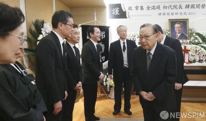 [서울=뉴스핌] 이형석 기자 = 정명식 포스코 중우회 회장(오른쪽)이 1일 오후 서울 강남구 삼성서울병원 장례식장에 마련된 고(故) 김만제 전 부총리 겸 경제기획원 장관의 빈소를 찾아 조문을 마친 뒤 유가족을 위로하고 있다. 고(故) 김 전 부총리는 지난달 31일 오후 12시20분 자택에서 숙환으로 별세했다. 2019.02.01 leehs@newspim.com