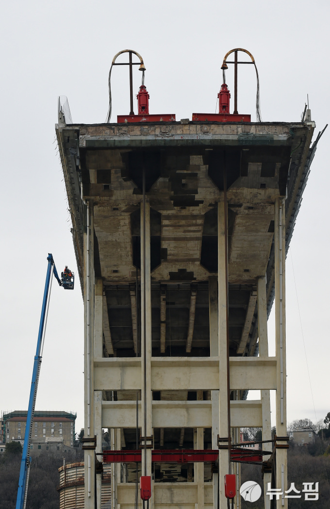 | [제노아 로이터=뉴스핌] 정윤영 인턴기자 = 7일(현지시각) 이탈리아 제노아에 위치한 모란디 다리가 붕괴된 가운데 작업자들이 다리를 해체하고 있다. 2019.02.07. |