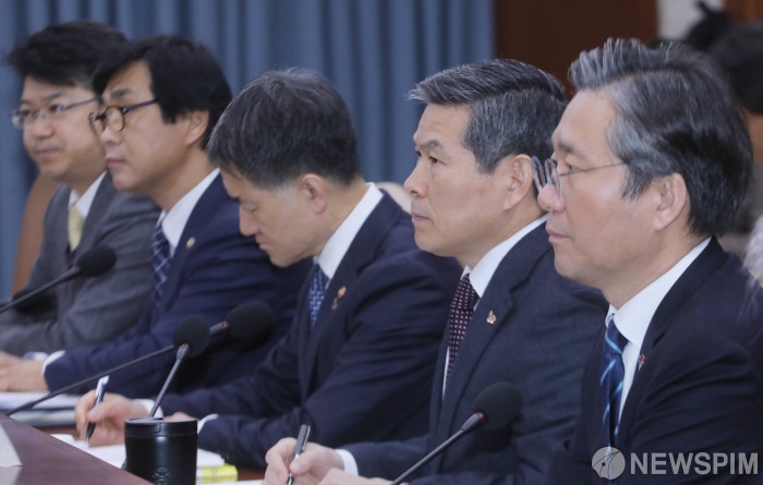 [서울=뉴스핌] 윤창빈 수습기자 = 성윤모 산업통상자원부장관(오른쪽부터),정경두 국방부장관,박능후 보건복지부장관과 참석자들이 14일 오전 서울 종로구 정부서울청사에서 열린 국정현안조정점검회의에 참석해 이낙연 국무총리의 모두발언을 듣고 있다. 2019.02.14 pangbin@newspim.com