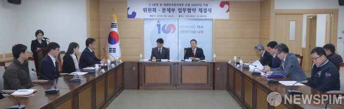 [서울=뉴스핌] 윤창빈 기자 = 15일 오전 서울 종로구 정부서울청사에서 ‘위원회-문체부 3.1운동 및 대한민국임시정부 수립 100주년 기념사업추진위원회 업무협약 체결식’이 열리고 있다. 2019.02.15 pangbin@newspim.com