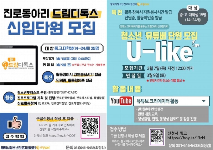 | 경기 평택시청소년진로지원센터 드림ON 자치동아리 '드림디톡스’, ‘U-Like’ 모집 홍보 포스터[사진=드림ON ] |