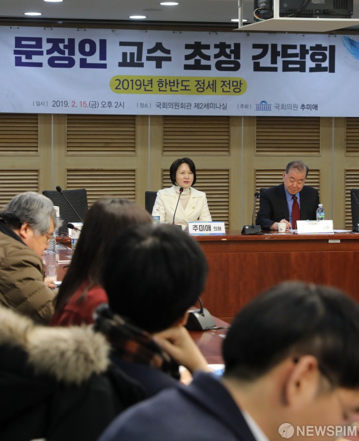 [서울=뉴스핌] 최상수 기자 = 추미애 더불어민주당 의원이 15일 오후 서울 여의도 국회 의원회관 2세미나실에서 열린 '2019년 한반도 정세 전망'을 주제로 한 문정인 대통령 통일외교안보특보(연세대 명예특임교수) 초청 간담회에서 발언하고 있다. 2019.02.15 kilroy023@newspim.com