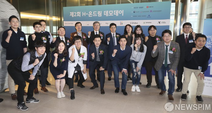 [서울=뉴스핌] 이형석 기자 = 이재갑 고용노동부장관(뒷줄 왼쪽 여섯번째 부터)과 공영운 현대자동차 사장(앞줄 오른쪽)을 비롯한 관계자들이 20일 오후 서울 중구 페럼타워에서 열린 제2회 H-온드림 데모데이에서 기념촬영을 하고 있다. 2019.02.20 leehs@newspim.com