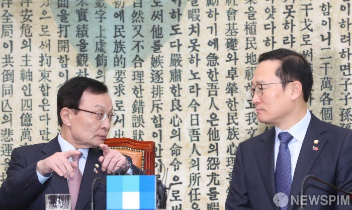 [서울=뉴스핌] 김학선 기자 = 이해찬 더불어민주당 대표와 홍영표 원내대표가 25일 국회에서 열린 3.1독립선언서 낭독 및 만세 재현행사에 참석해 있다. 2019.02.25 yooksa@newspim.com