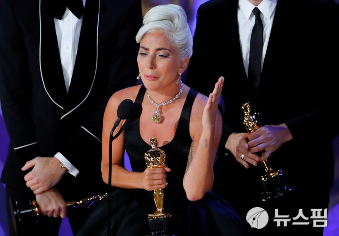 | [로스앤젤레스 로이터=뉴스핌] 남혜경 인턴기자 = 레이디 가가가 24일(현지시간) 미국 캘리포니아주 로스앤젤레스에서 열린 '제91회 아카데미 시상식'에서 '스타 이즈 본'(A Star Is Born)의 주제가 'Shallow'로 주제가상을 수상했다. 2019.02.24. |