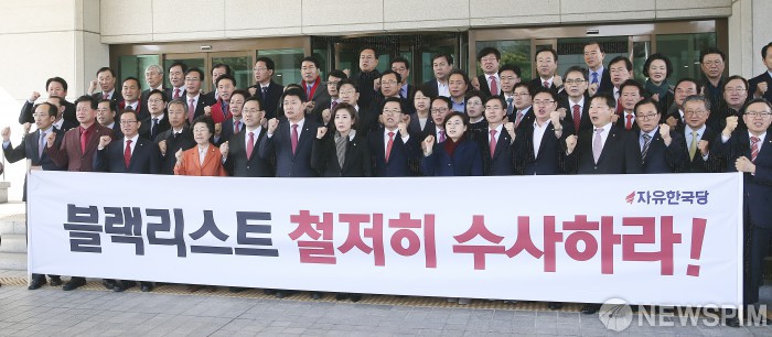 [서울=뉴스핌] 이형석 기자 = 나경원 자유한국당 원내대표를 비롯한 의원들이 26일 서울 서초구 대검찰청에서 항의방문을 마치고 나서며 환경부 블랙리스트 수사를 촉구하는 구호를 외치고 있다. 2019.02.26 leehs@newspim.com