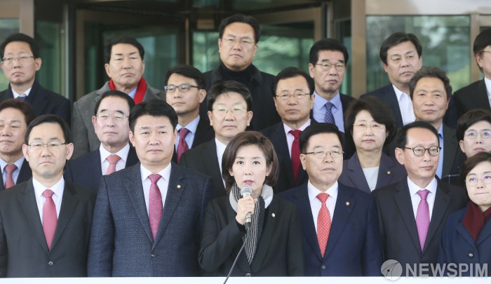 [서울=뉴스핌] 이형석 기자 = 나경원 자유한국당 원내대표가 26일 서울 서초구 대검찰청에서 항의방문을 마치고 나서며 환경부 블랙리스트 수사를 촉구하는 발언을 하고 있다. 2019.02.26 leehs@newspim.com