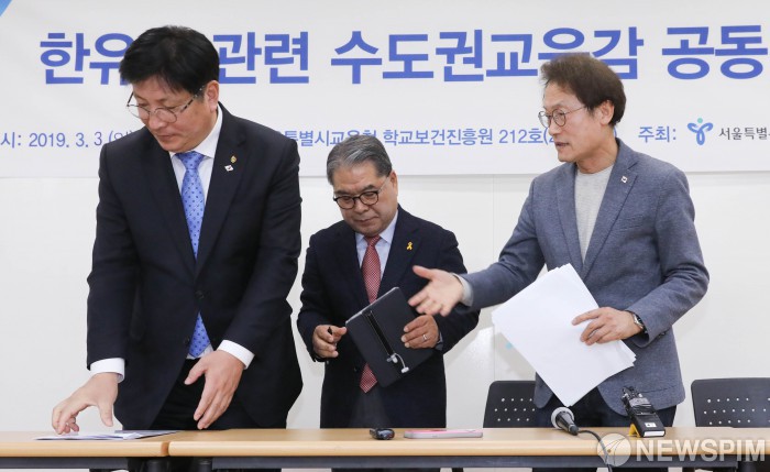 [서울=뉴스핌] 최상수 기자 = 도성훈 인천시 교육감, 이재정 경기도 교육감, 조희연 서울시 교육감이 3일 오후 서울 종로구 서울특별시교육청에서 열린 한유총 관련 수도권교육감 공동 기자회견을 마친 뒤 나서고 있다. 2019.03.03 kilroy023@newspim.com