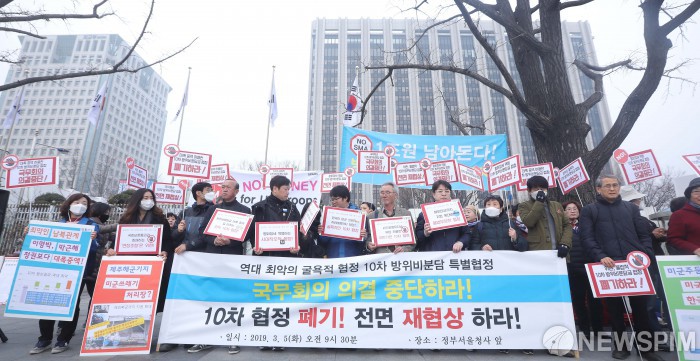 [서울=뉴스핌] 윤창빈 기자 = 5일 오전 서울 종로구 정부서울청사 앞에서 평화와통일을여는사람들 회원들이 방위비 분담 특별협정 국무회의 의결 중단을 촉구하는 기자회견을 진행하고 있다. 2019.03.05 pangbin@newspim.com