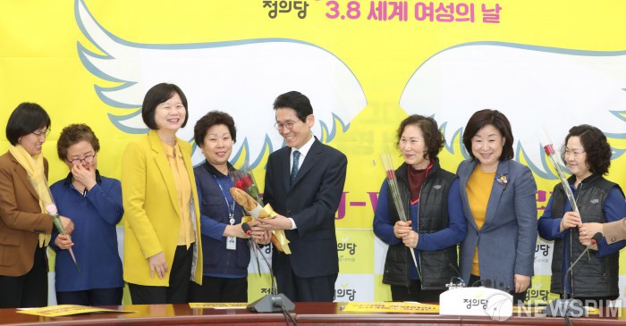 [서울=뉴스핌] 김학선 기자 = 이정미 정의당 대표와 윤소하 원내대표, 심상정 의원 등이 6일 국회에서 열린 2019 3·8 세계 여성의날 기념식 '여성에게 빵과 장미를' 행사에서 국회 여성 노동자들에게 장미꽃과 빵을 전달하고 있다. 2019.03.06 yooksa@newspim.com