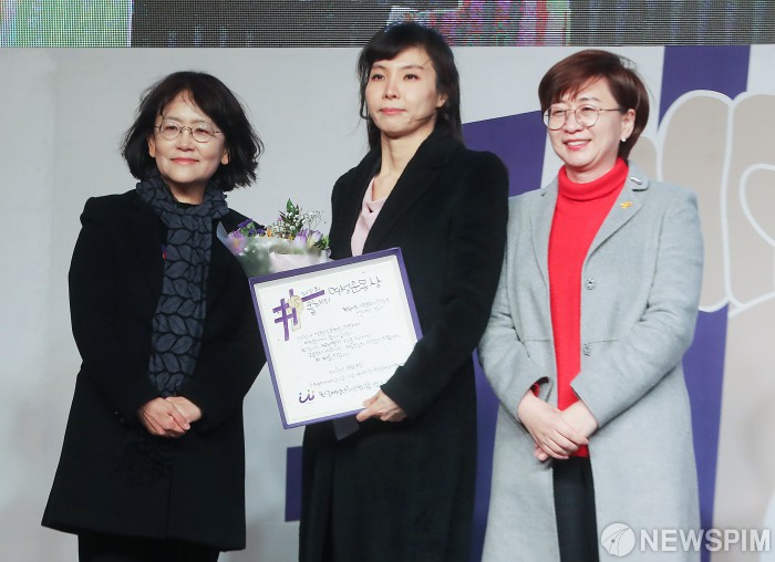 [서울=뉴스핌] 윤창빈 기자 = 서지현 검사(가운데)가 8일 오후 서울 종로구 광화문광장에서 열린 3·8 세계 여성의 날기념 제35회 한국여성대회에서 올해의 여성운동상을 수상한 후 기념촬영을 하고 있다. 2019.03.08 pangbin@newspim.com